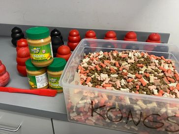 KONGS are a type of food puzzle enrichment. Filled with treats, sealed with peanut butter or other yummy options, then frozen to make them last longer. KONGS give dogs some entertainment while hanging out in their kennels!